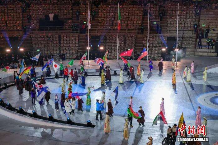 ▲当地时间2026年2月22日,2026年米兰-科尔蒂纳冬奥会闭幕式在意大利维罗纳奥林匹克竞技场举行。图为各体育代表团旗帜在闭幕式上入场。中新社记者 骆云飞 摄