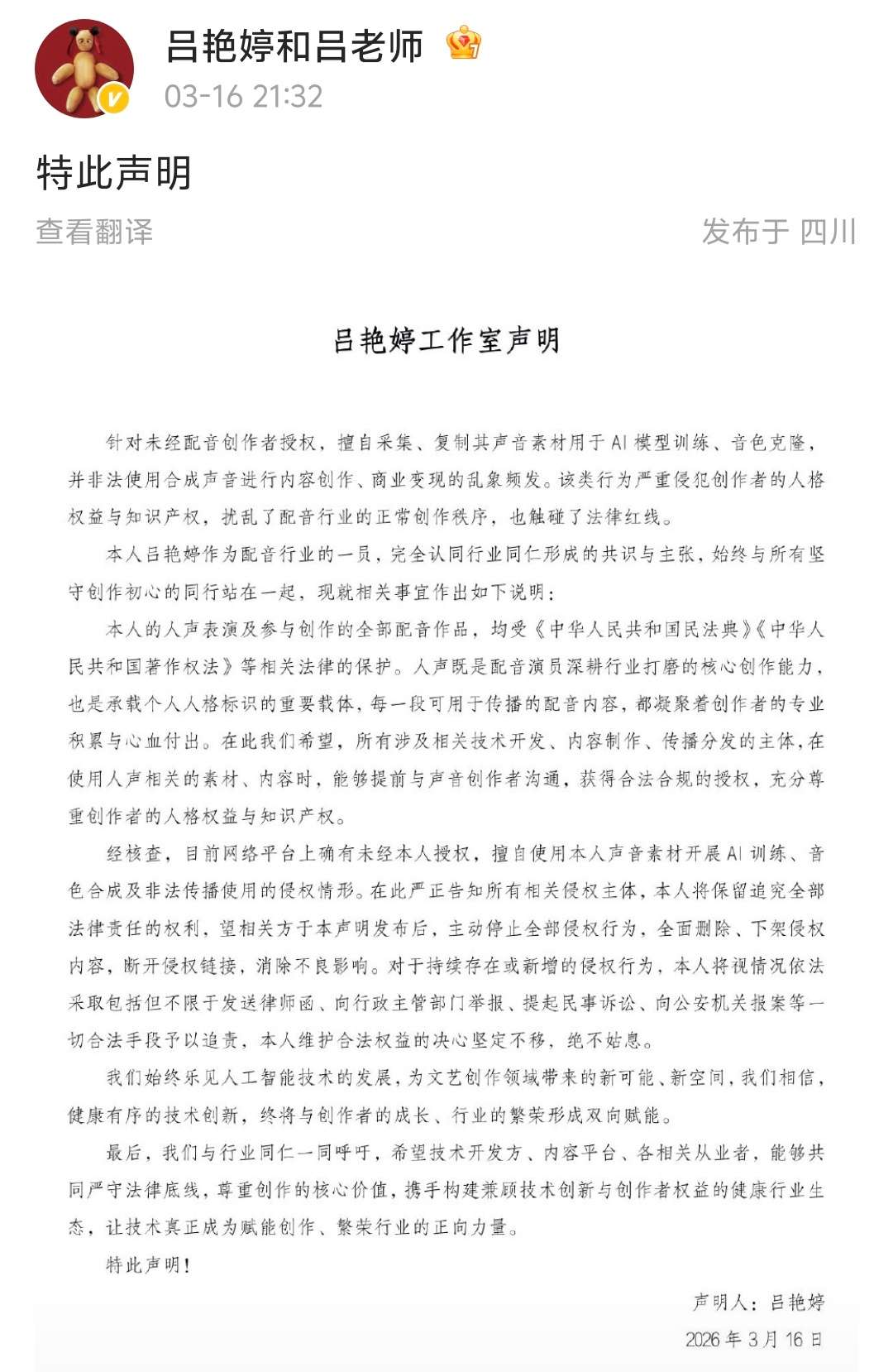 中新网北京3月18日电(记者 任思雨)“本人维护合法权益的决心坚定不移,绝不姑息。”3月16日晚,曾在《哪吒》系列电影中为“哪吒”配音的配音演员吕艳婷发布声明,呼吁停止未经授权擅自用其声音开展AI训练、音色合成及非法传播使用的侵权行为。
