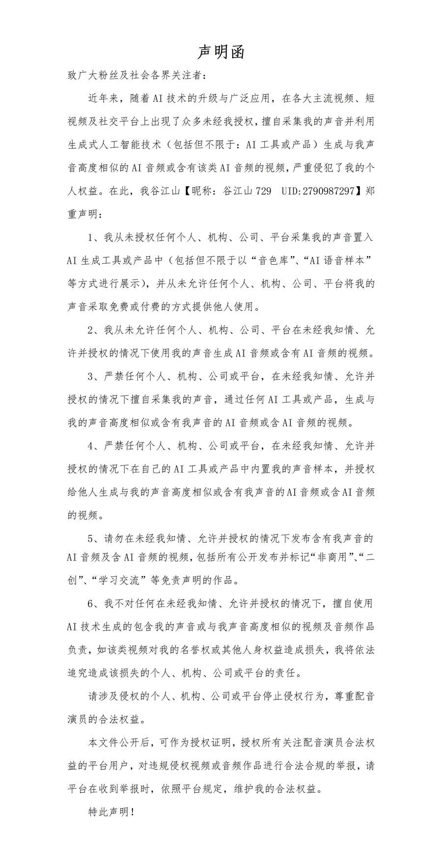 ▲配音演员谷江山声明函。(图片来自谷江山微博)