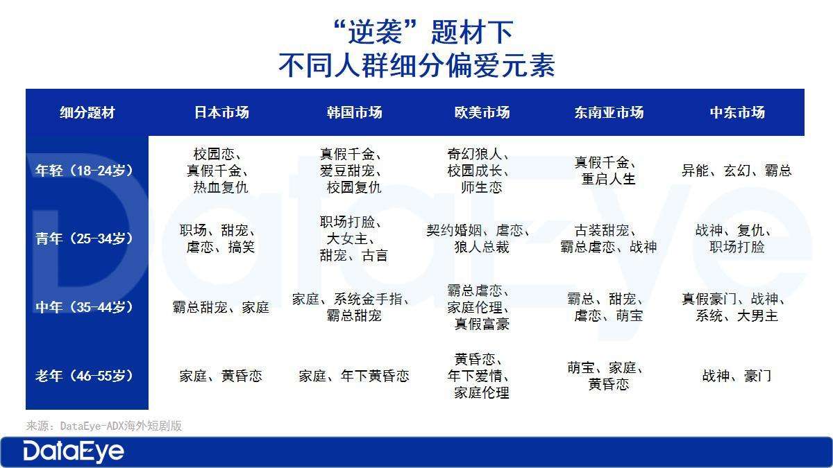 ▲DataEye统计的“逆袭”题材的微短剧中,不同人群细分偏爱元素。图源:DataEye-ADX海外短剧版