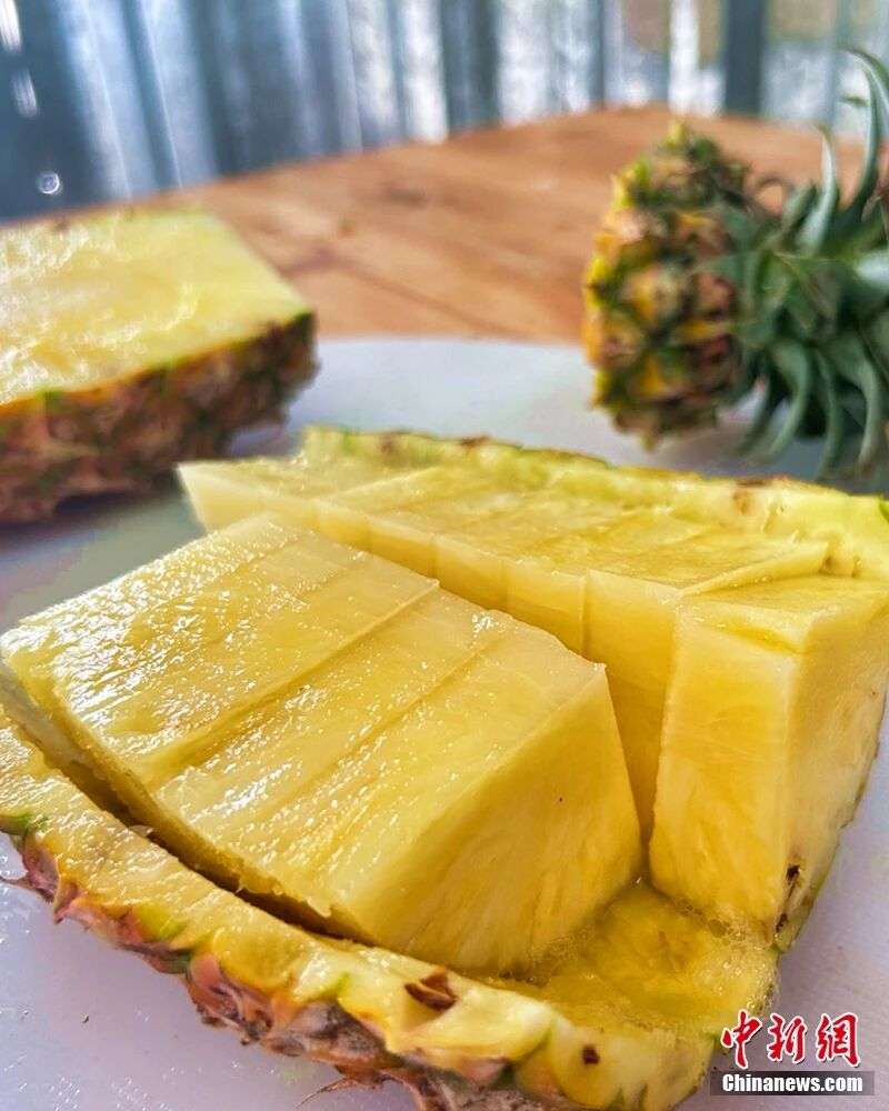 ▲刚切开的凤梨,每一丝纹理都浸透了蜜色汁水,衬得果肉愈发晶莹。清甜的香气满含阳光滋味。(图片来自中新网)