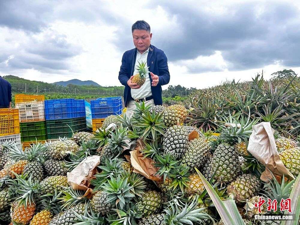 ▲3月11日,在海南万宁龙滚,曾才在凤梨种植基地查看采收的凤梨品质。(图片来自中新网)