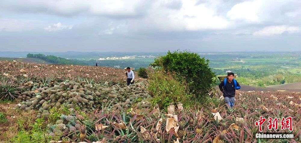 ▲在凤梨采收现场,果农们忙碌分拣入筐、搬上货车,把热带的鲜甜从田间送往远方。(图片来自中新网)