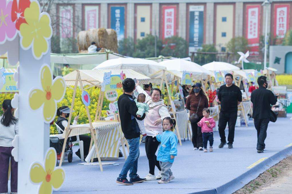 ▲建德市更楼街道城南城市田园油菜花田边的消费市集。(图片来自新华社)