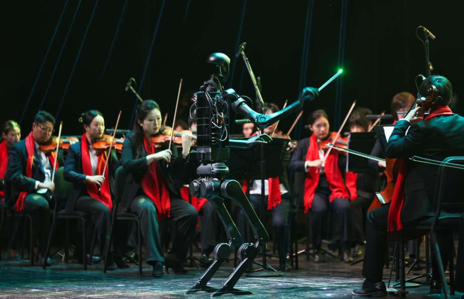 ▲2025年12月28日,江西南昌,AI机器人“智音”执棒指挥乐队演奏。(图片来自中新社)