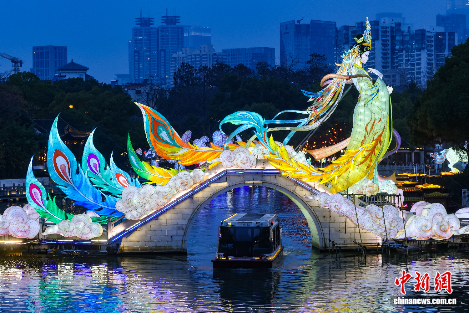 ▲2026年2月27日,江苏南京,游船从展出的大型彩灯下驶过。(图片来自中新社)