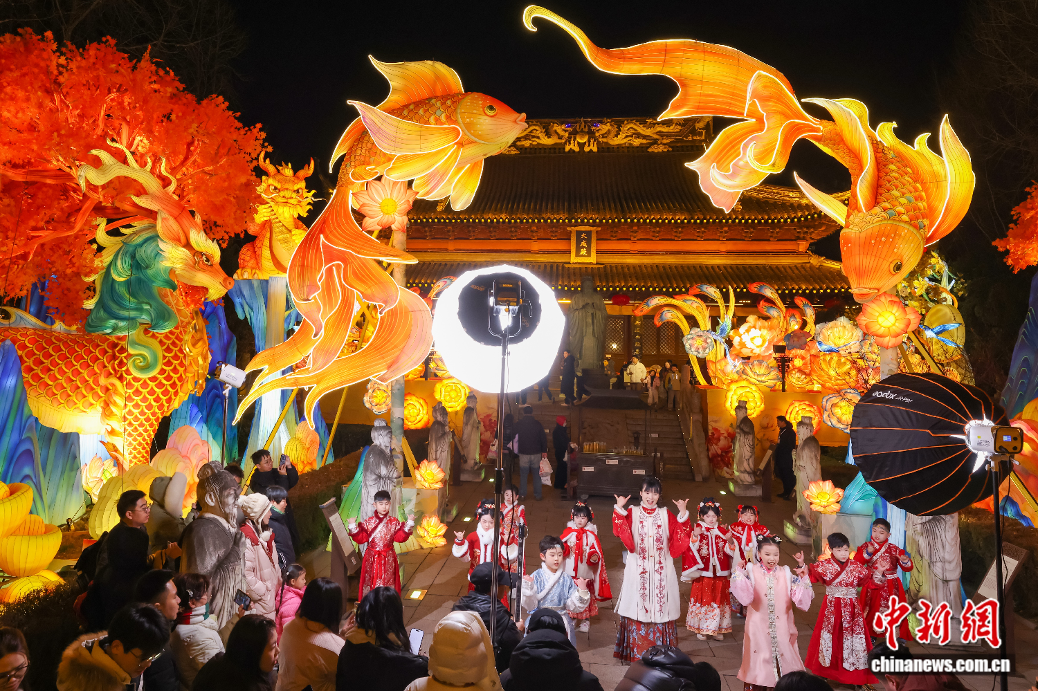 ▲2026年2月7日,江苏南京,年轻人带领着孩子们在夫子庙亮起的彩灯前拍摄短片。(图片来自中新社)