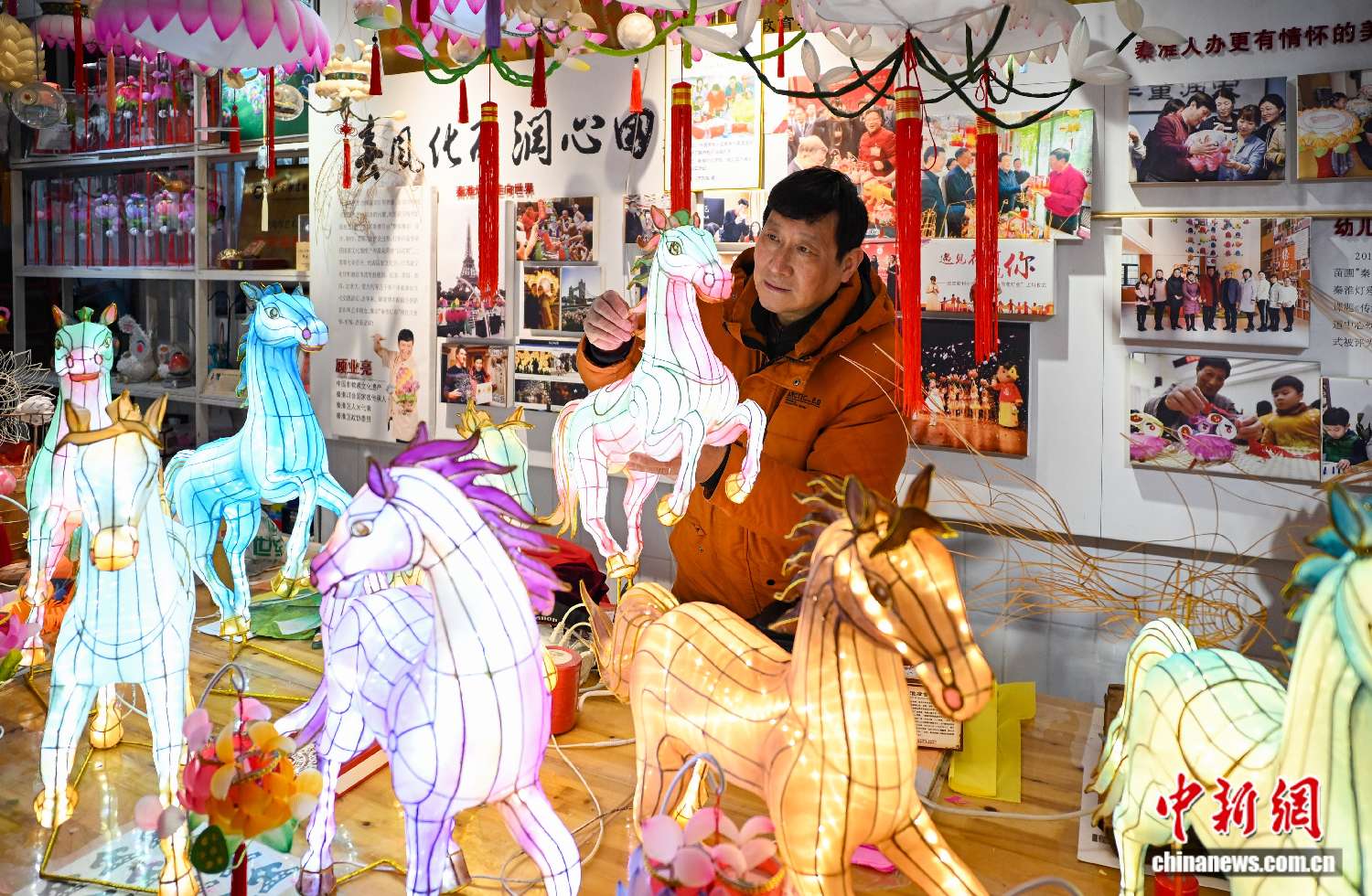 ▲2026年1月27日,江苏南京小西湖灯彩工作室内,国家级非物质文化遗产代表性项目秦淮灯会代表性传承人顾业亮正在赶制名为“八骏图”的新春花灯。(图片来自中新社)