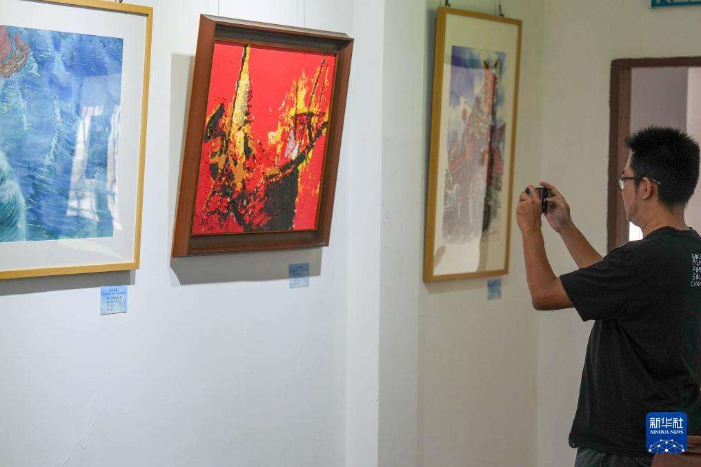 ▲3月28日,一名男子在马来西亚马六甲市参观中马送王船主题美术作品创作展时拍照。新华社记者陈泽国 摄