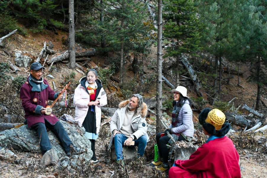 ▲2025年1月,中外民众在云南省迪庆藏族自治州徒步、休息。(图片来自中新社)