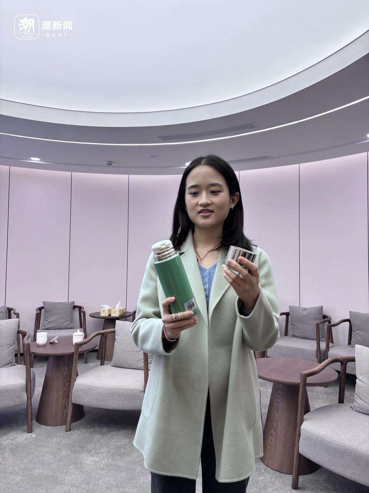 ▲朱溪瑞在平湖老家获赠了一个非常“有梗”的礼物——喝热水用的保温杯。记者陈黎明摄