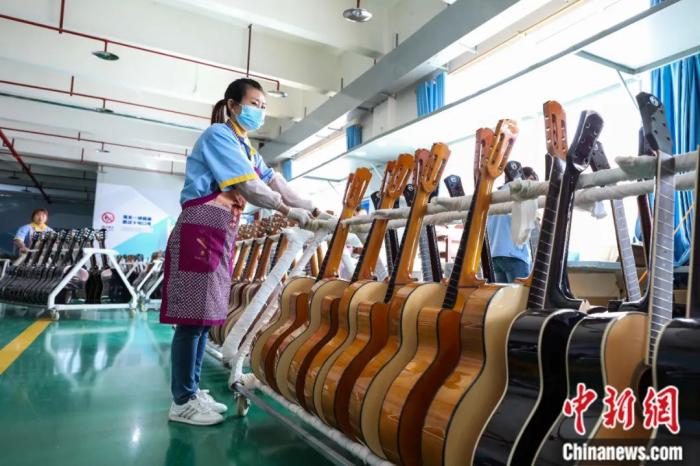 ▲贵州省正安县被誉为“中国吉他之都”,从2013年开始发展吉他产业,目前年产吉他600万把,辐射带动了1.4万人就业,帮助7000余人脱贫。图为该县一家吉他生产车间。瞿宏伦 摄