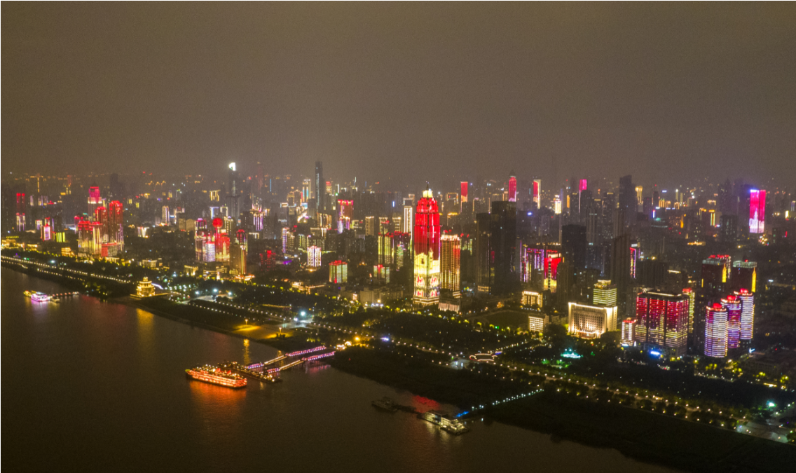 ▲10月1日晚,湖北武汉,长江灯光秀国庆特辑在两江四岸沿江楼宇上演。(图片来自中新社)