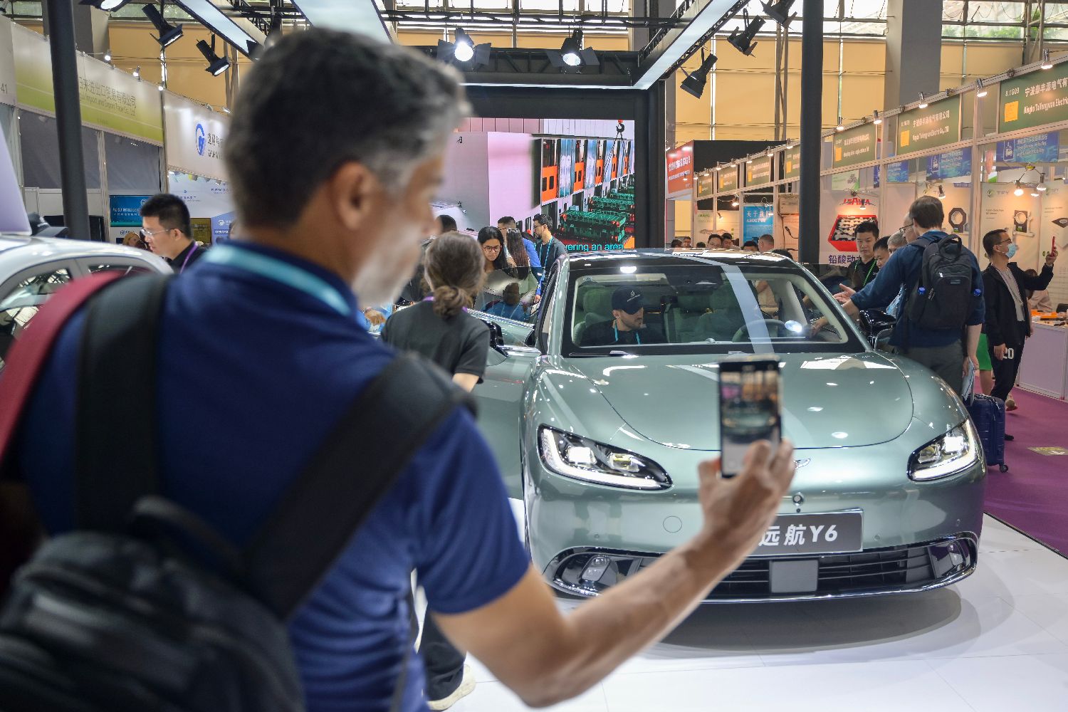 ▲4月15日,第135届中国进出口商品交易会(广交会)在广州开幕,新能源汽车展区吸引采购商参观咨询。图为一款新能源汽车吸引采购商。(图片来自中新社)