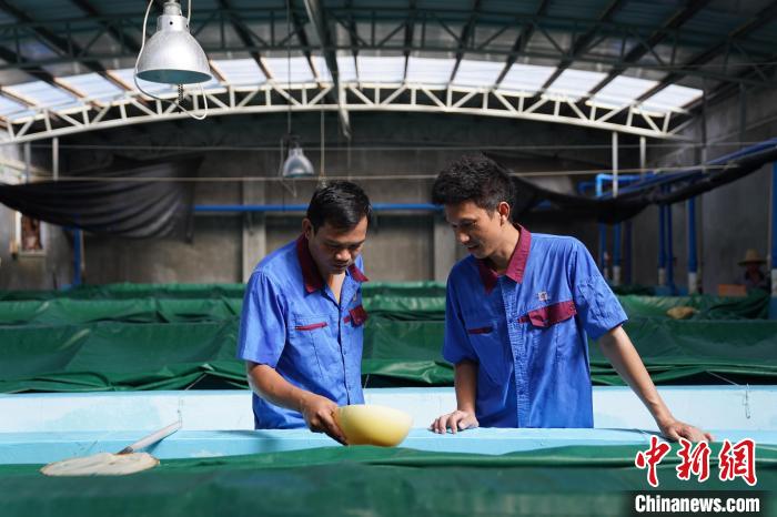 ▲3月14日,泰国技术专家在位于海南文昌市铺前镇的卜蜂水产(东方)有限公司虾苗场查看虾苗的生长状况。陈英清 摄