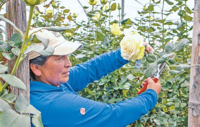 ▲绿叶农场玫瑰种植园内,一名员工正在采摘玫瑰。(图片来自《人民日报》)