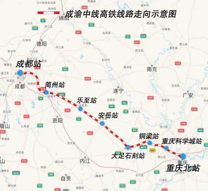 ▲成渝中线高铁线路走向示意图。(图片来自中新网)