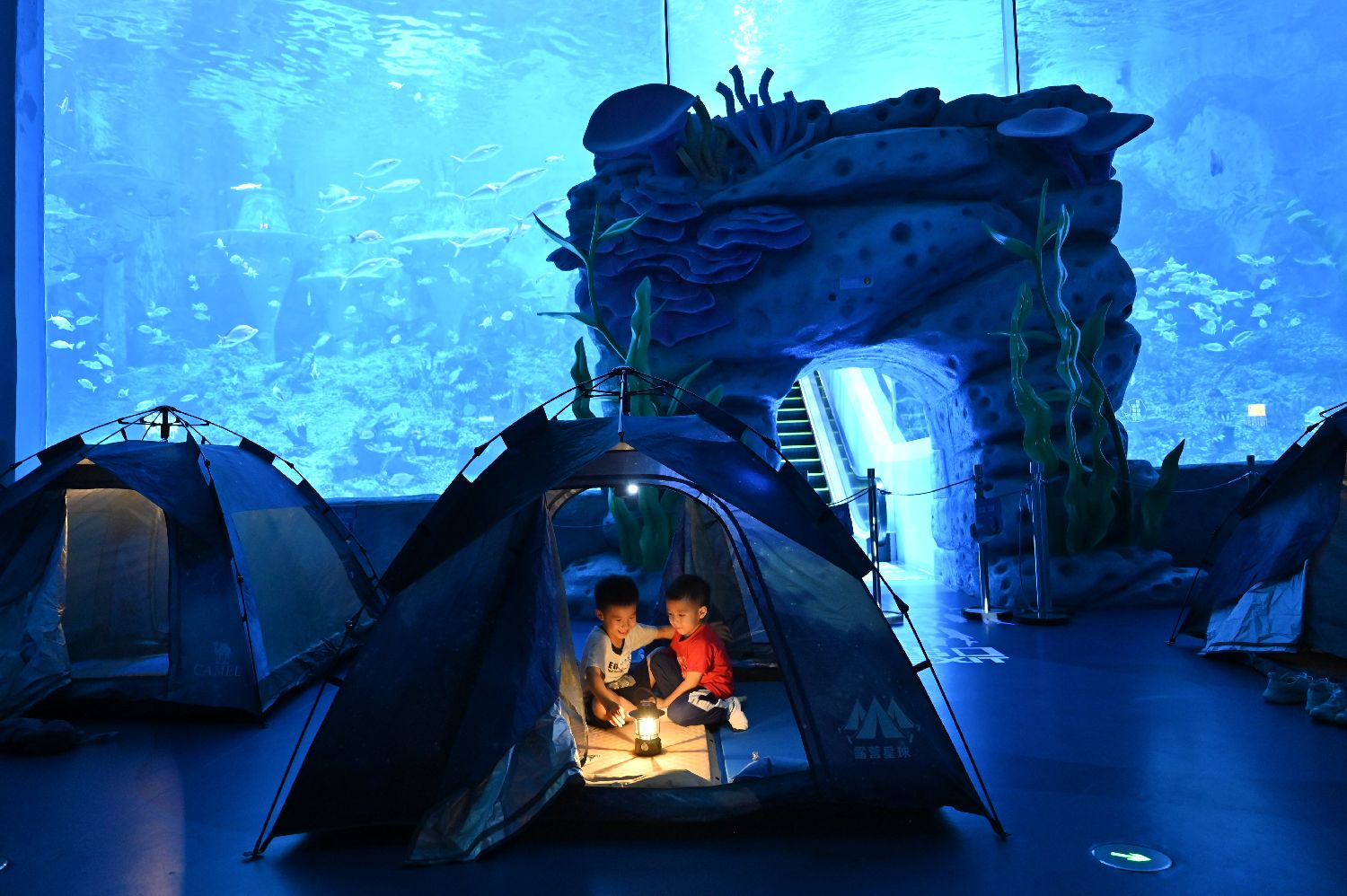 ▲7月10日晚,广东广州动物园携手广州海洋馆推出首期“海陆空一夜营”活动,带领亲子家庭走进“动物奇妙夜”,探秘动物们的夜间行为。图为小朋友在广州海洋馆内露营。(图片来自中新社)