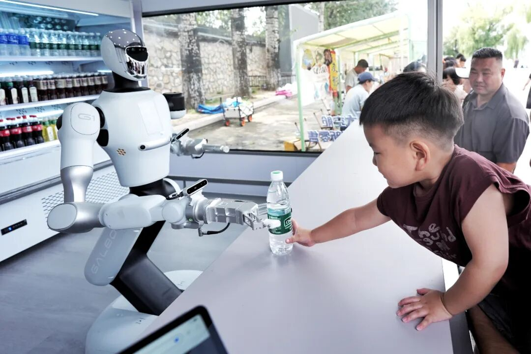 ▲在北京颐和园的一家机器人零售店,机器人向小朋友交付商品。(图片来自中新社)