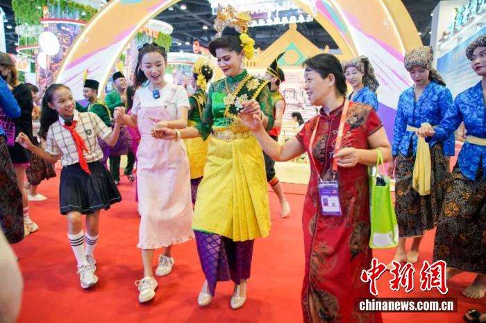 ▲2024年9月27日,在广西南宁举办的第21届中国—东盟博览会迎来首个公众开放日,民众进入会场逛展、购物。图为参观者在马来西亚柔佛州展位与演员共舞。中新社记者陈冠言摄