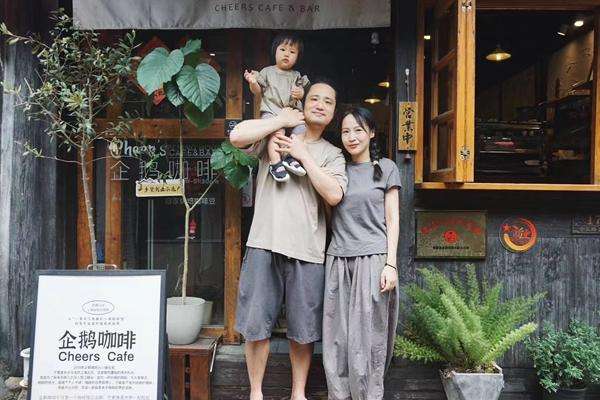 ▲徐超和妻子黄丹英、孩子在自家的咖啡店前合影。(受访者供《中国青年报》)