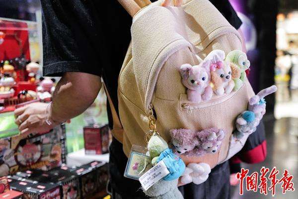 ▲9月18日,北京一家潮玩店,一名男生的背包上挂了多个玩偶。(图片来自《中国青年报》)