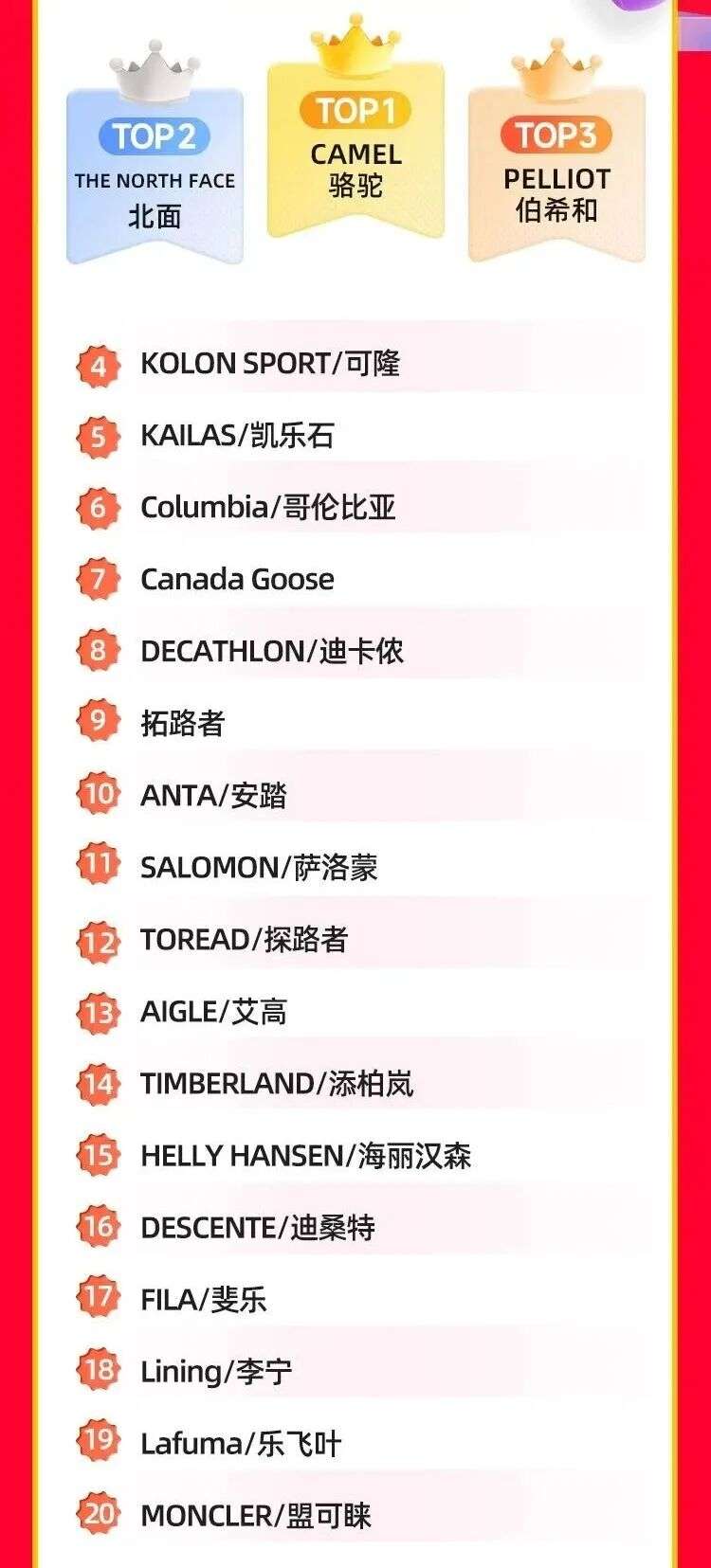 不仅是羽绒服品牌,高端户外品牌也正大举进军高端羽绒服市场。今年“双11”,天猫户外品牌成交榜TOP20中,Moncler首次入榜,但仅位列第20名,排在前面的是北面、可隆、凯乐石、萨洛蒙、艾高、海丽汉森、迪桑特等专业户外品牌。