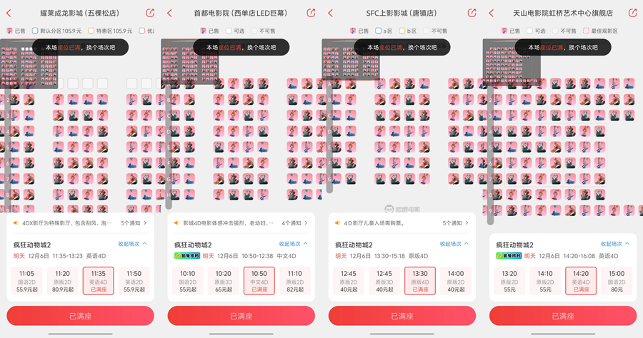 ▲12月6日,北京、上海多家影城《疯狂动物城2》4D厅显示满座。