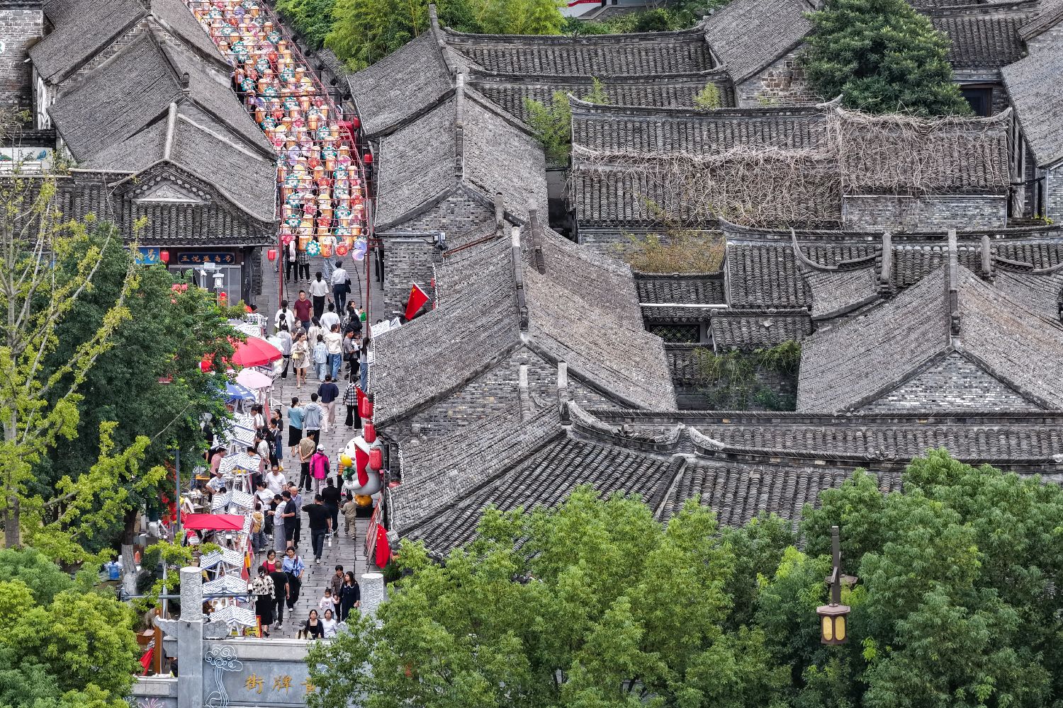 ▲10月1日,江苏淮安,民众走进盱眙县第一山历史文化街区品“文化大集”。(图片来自中新社)