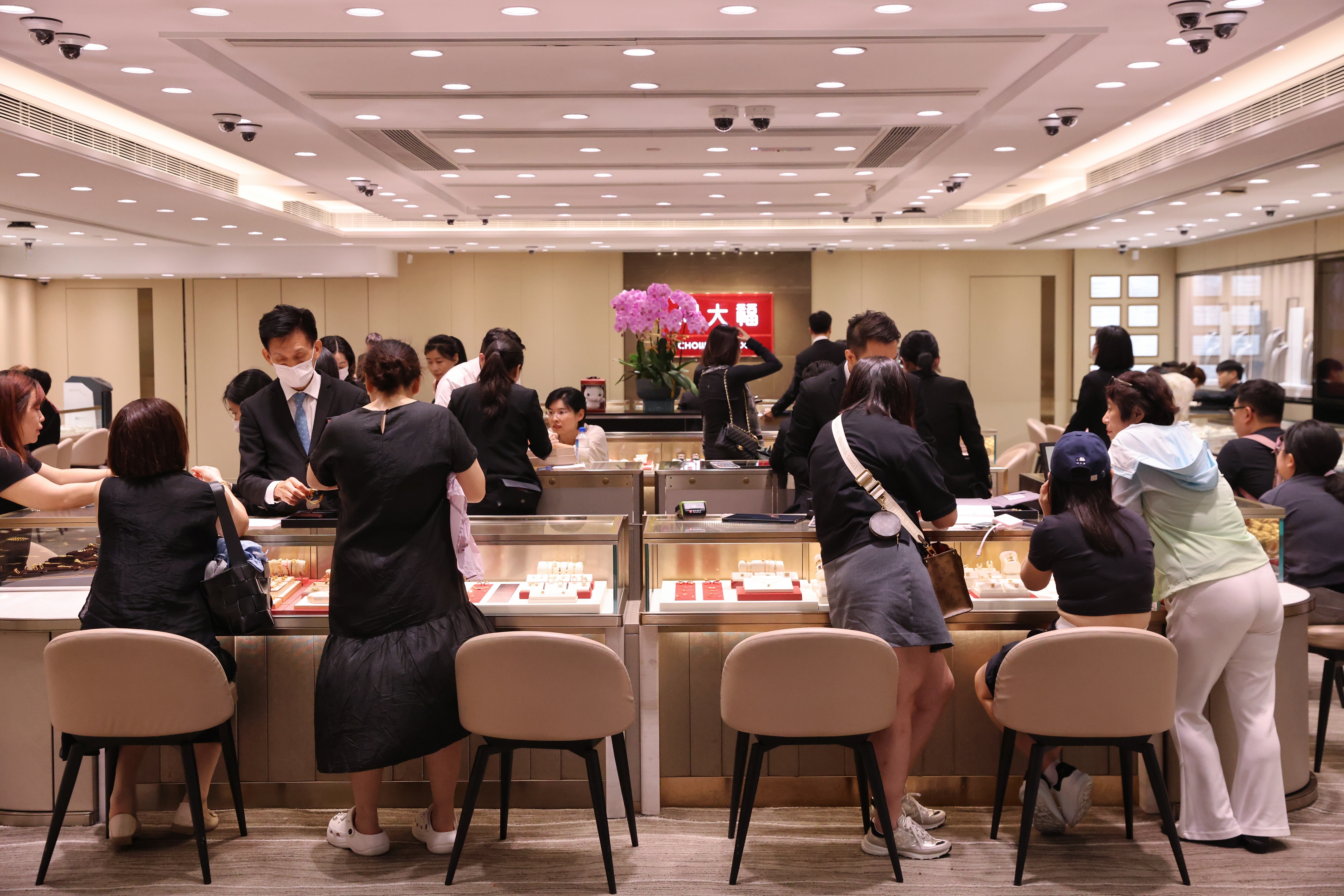 ▲10月3日,香港尖沙咀一间金饰店内,大批顾客在选购金饰。(图片来自香港中通社)