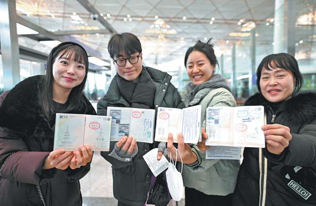 ▲韩国游客在北京首都国际机场展示护照上的入境印章。(图片来自新华社)
