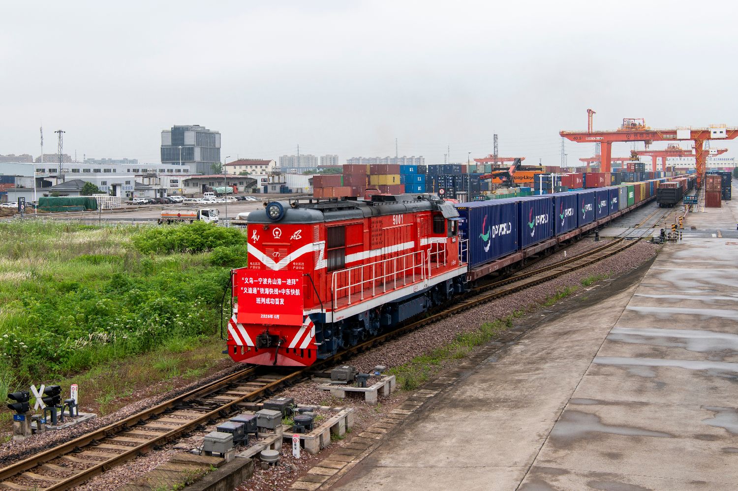 ▲5月18日,“义乌一宁波舟山港一迪拜”“义迪通”“铁海快线+中东快航”班列在浙江义乌首发。图为班列发运。(图片来自中新社)