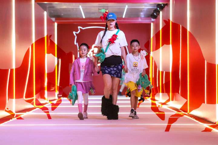 ▲1月26日晚,在甘肃省博物馆一楼大厅,模特(中)佩戴新款马踏飞燕贺岁毛绒玩偶“红运当头马”走秀。(图片来自新华社)