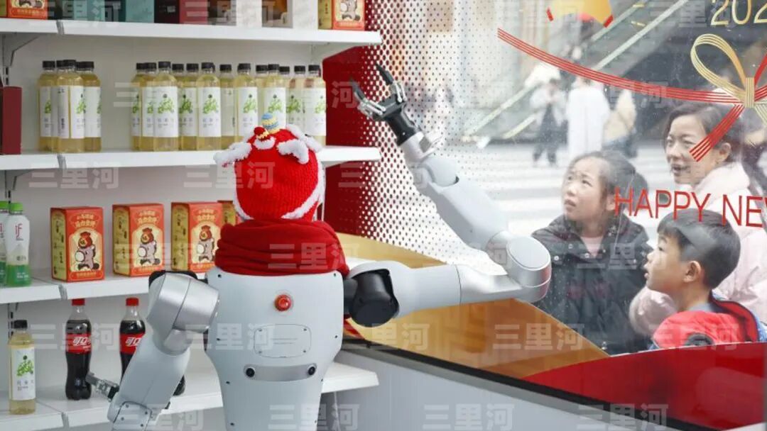 ▲机器人售货员为顾客拿饮料。(图片来自中新社)