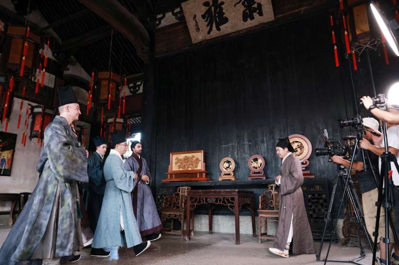 ▲2025年8月24日,国际友人在浙江金华东阳卢宅景区体验微短剧拍摄。(图片来自中新社)