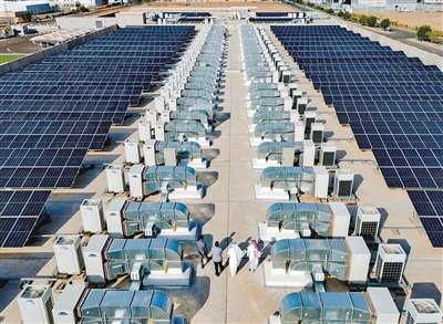 ▲布设在沙特阿拉伯一家制衣工厂楼顶的“光储空”系统。珠海格力电器股份有限公司供图