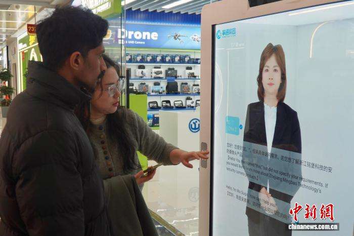 ▲2月28日,浙江义乌,中外客商在店铺门前与多语种数字人对话,了解市场及产品。(图片来自中新网)