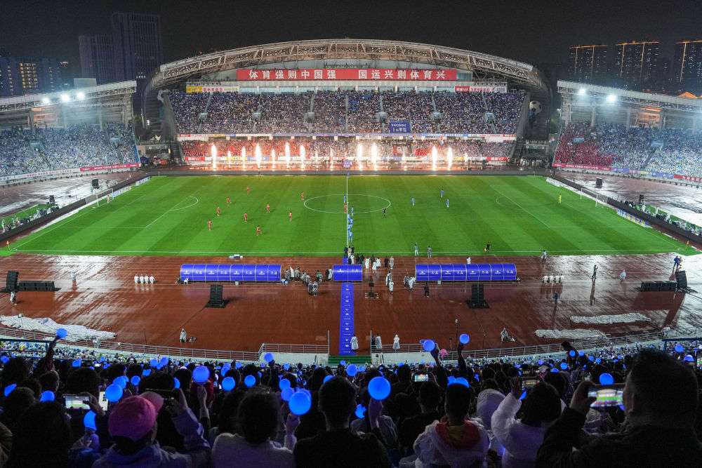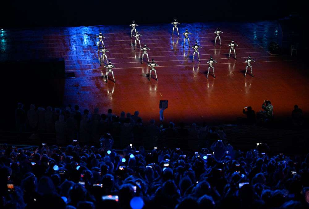 ▲4月11日,机器人在“苏超”开幕式上表演。(图片来自新华社)