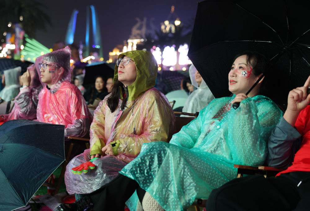 ▲4月11日,观众在常州市迪诺水镇冒雨观看“苏超”揭幕战直播。(图片来自新华社)