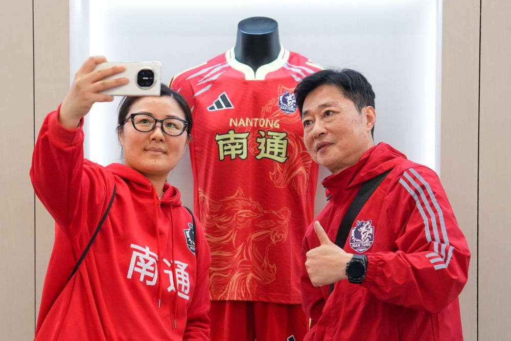 ▲4月11日,两位南通队球迷在常州奥体中心“苏超”球衣展示区拍照留念。(图片来自新华社)
