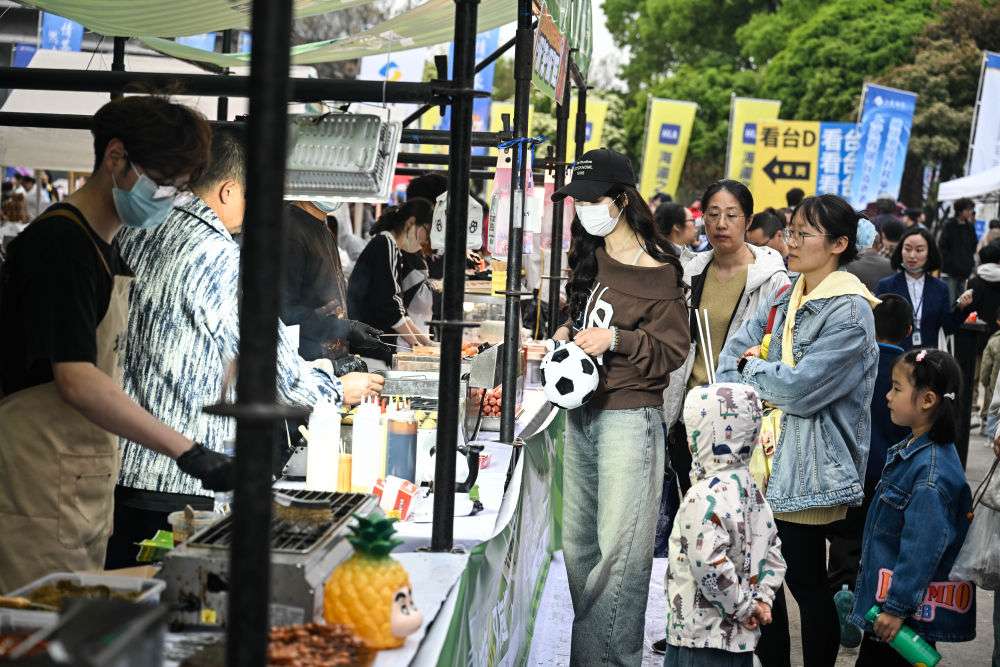 ▲4月11日,观众在常州奥体中心的“苏超”市集上休闲消费。(图片来自新华社)