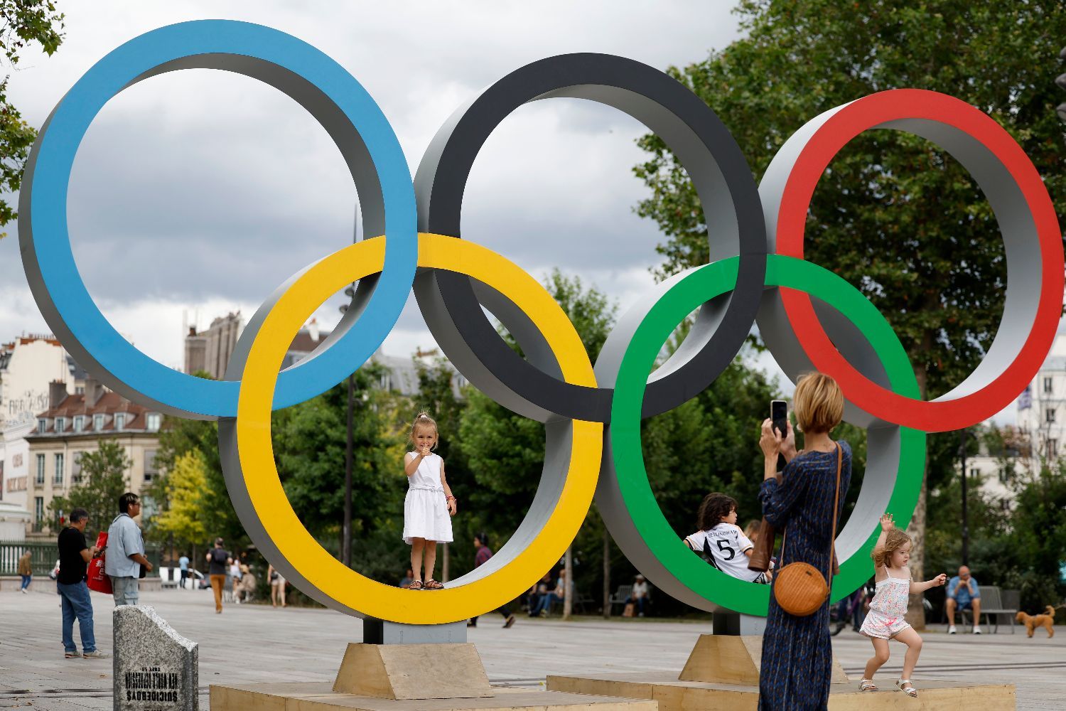 ▲巴黎奥运会开幕在即,巴黎街头奥运氛围浓。图为游客在巴士底广场与奥运五环标志合影。(图片来自中新社)