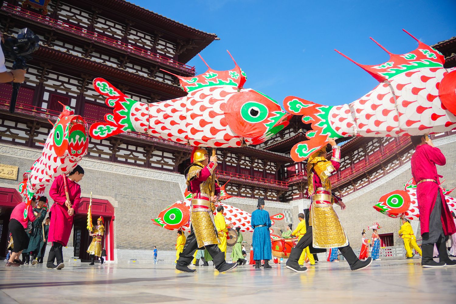 ▲2024年10月1日,国庆假期首日,河南洛阳隋唐洛阳城应天门景点上演“盛世隋唐国潮盛宴”主题活动,迎接八方游客。图为安徽省级非遗代表性项目汪满田鱼灯巡游队伍。(图片来自中新社)