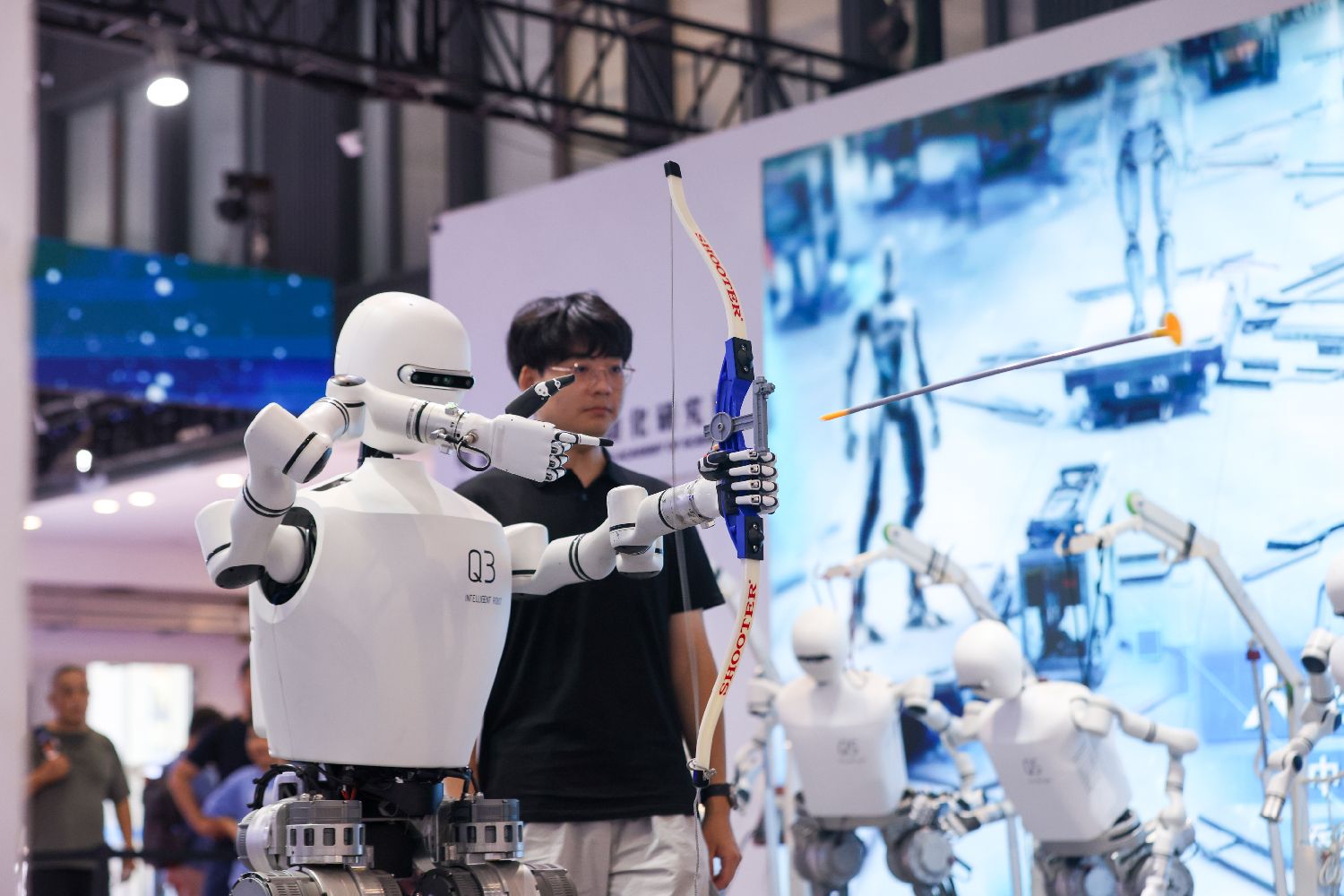▲8月11日,2025世界机器人大会继续在北京亦庄举行,展出的各类机器人刮起运动旋风。图为人形机器人展示射箭技能。(图片来自中新社)
