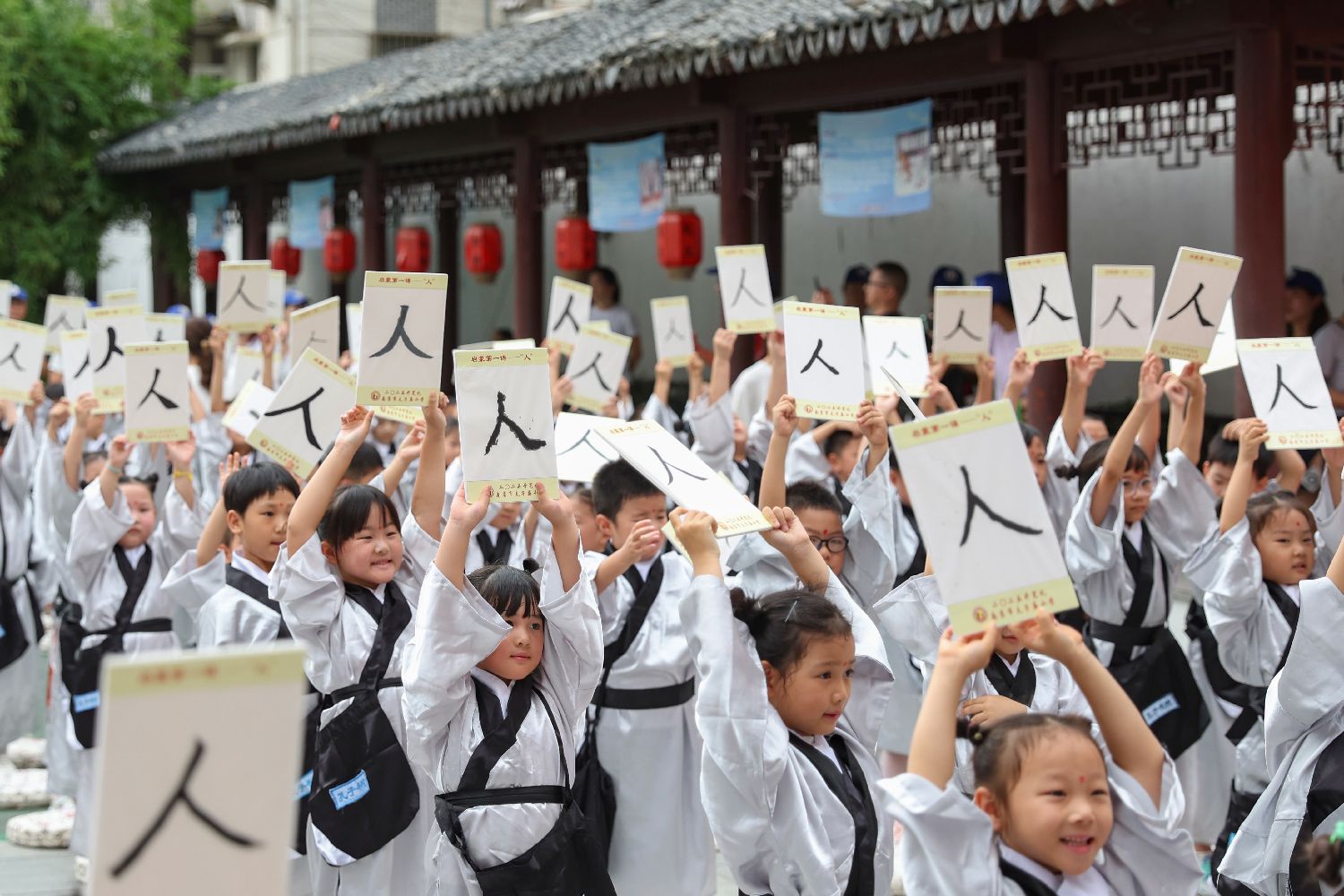 ▲8月31日,江苏南京夫子庙小学一年级新生身着古装举起“人”字。当日,该校为一年级新生举办2025年“开笔礼”仪式。(图片来自中新社)