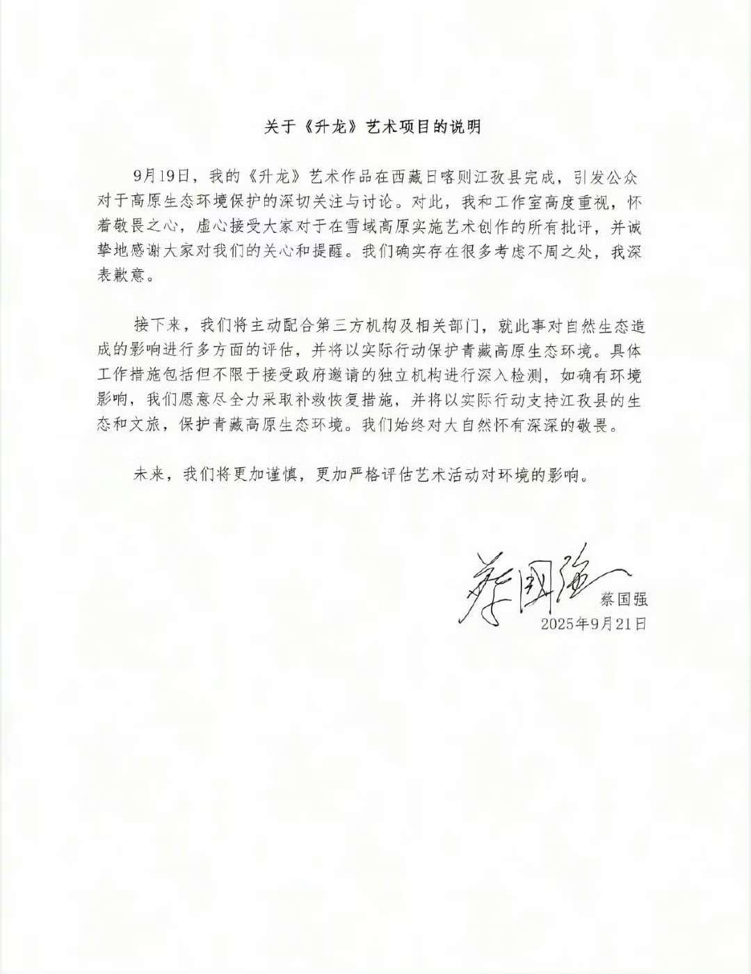 中新网北京9月21日电 (记者 张曦)在网友持续不断的质疑与批评声中,9月21日,高端户外品牌始祖鸟与国际知名艺术家蔡国强终于就其于喜马拉雅山脉燃放的烟花作品《升龙》公开道歉。同日,日喀则市委、市政府宣布成立调查组赶赴现场核查,并表示将依法依规处理后续事宜。