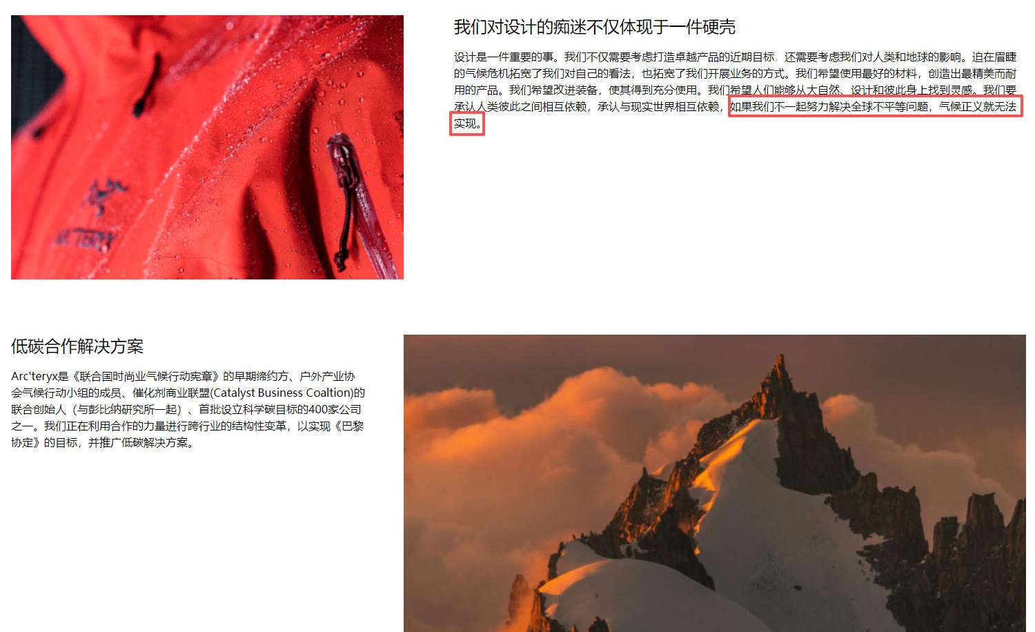 同样颇具讽刺意味的是,在始祖鸟的官方网站上,品牌不吝笔墨地强调其环保承诺,更是提出“没有气候正义,就无法实现全球平等”的宏大论述。