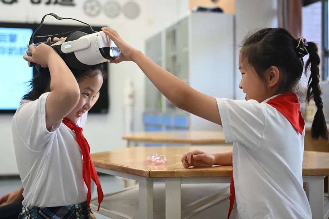 ▲2025年9月22日,江苏南京,位于雨花台区的小行小学的孩子们在教室内体验VR眼镜。该校积极推动人工智能与教育融合,开设人工智能教育课程。中新社记者 泱波 摄