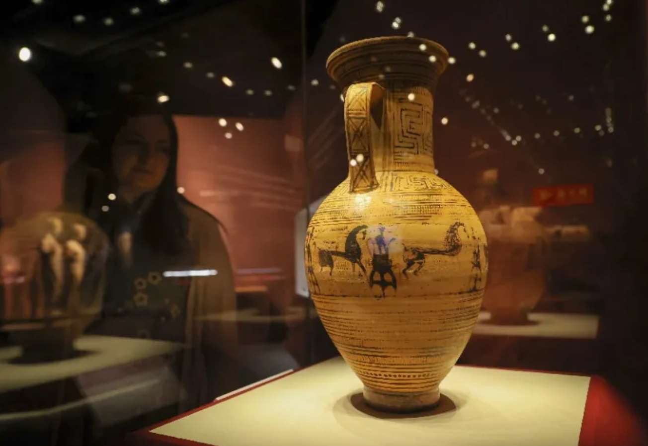 ▲古希腊文物阿提卡晚期几何纹双耳瓶上的马纹样。(图片来自中新社)