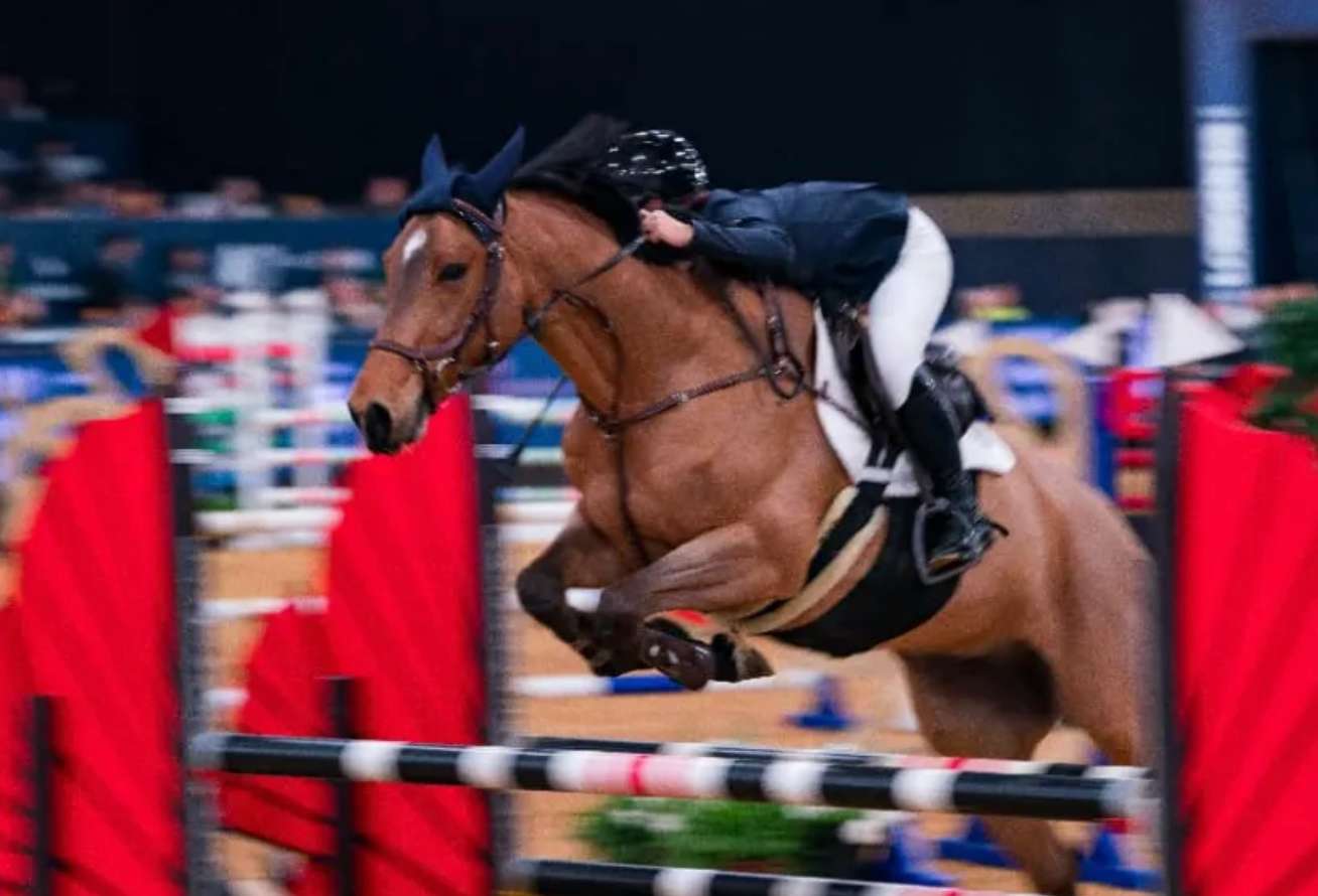 ▲在第二届浪琴香港国际马术盛典上,一名泰国骑手驾驭马匹越过障碍。(图片来自中新社)